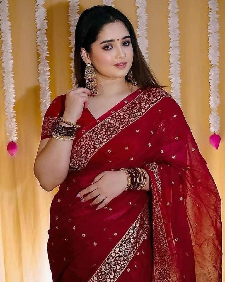 সম্পূর্ণ শাড়িতে উন্নতমানের এমব্রডারির কাজ করা।