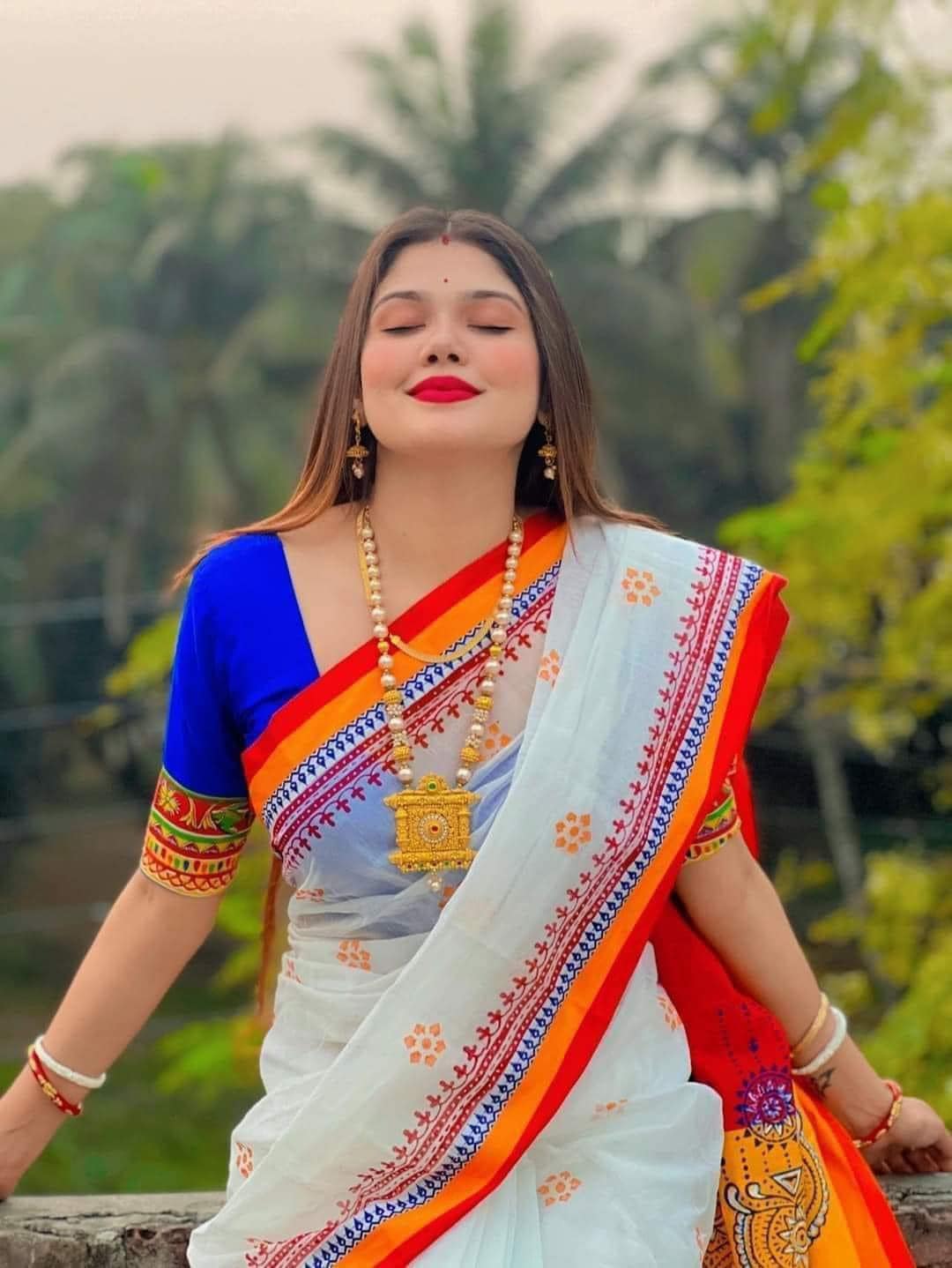 ২। পুরো শাড়িতে আকর্ষণীয় ডিজিটাল প্রিন্টরের কাজ।