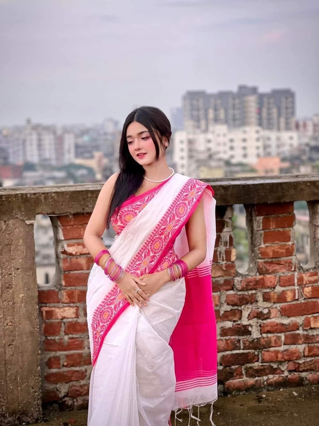 ২। পুরো শাড়িতে আকর্ষণীয় ডিজিটাল প্রিন্টরের কাজ।