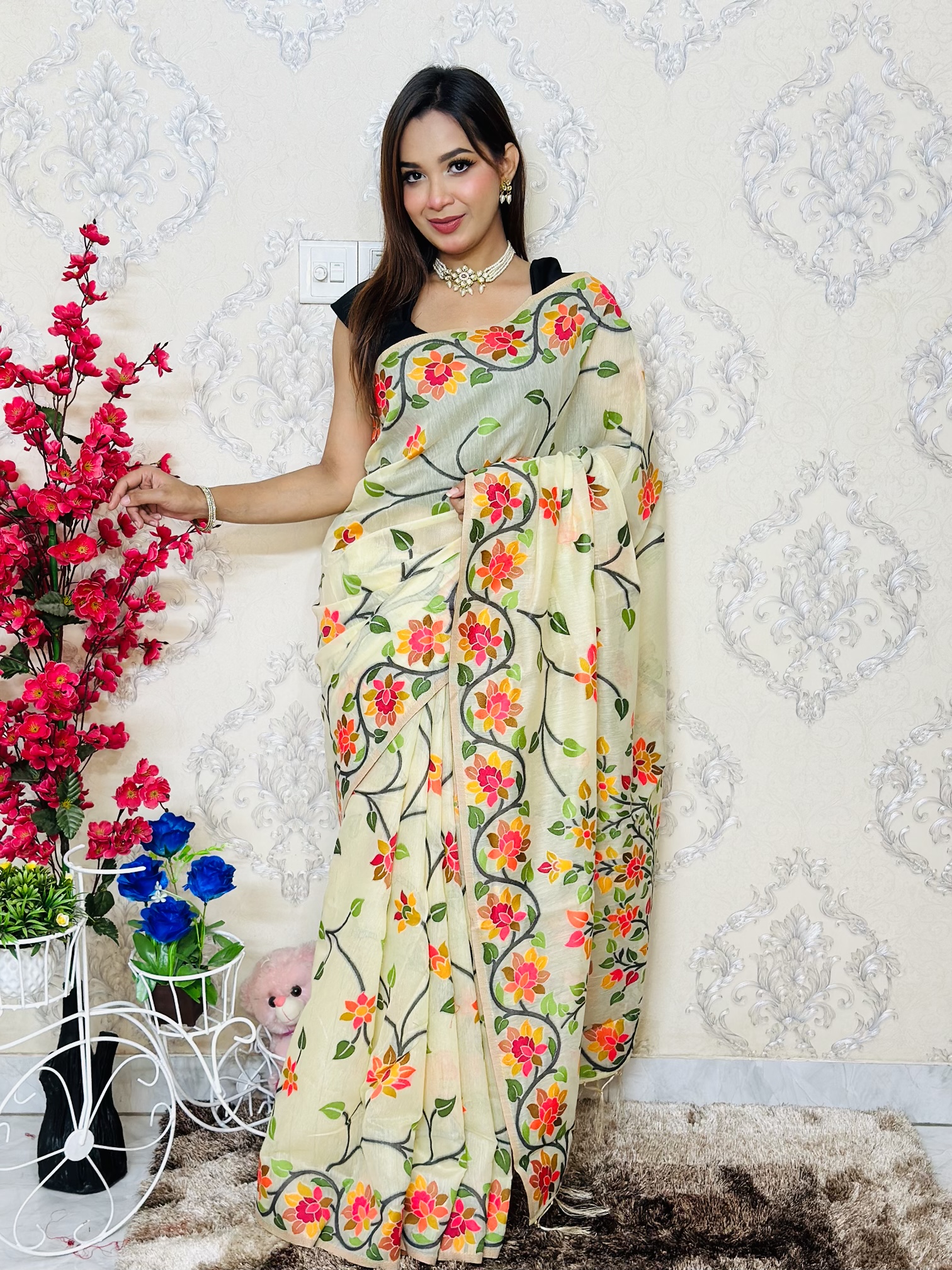 14 হাত শাড়ি। সাথে রানিং ব্লাইজ পিস আছে। ফুল বডি জুড়ে সুতার কাজ করা, কাপড়টা খুব সফ্ট হবে।